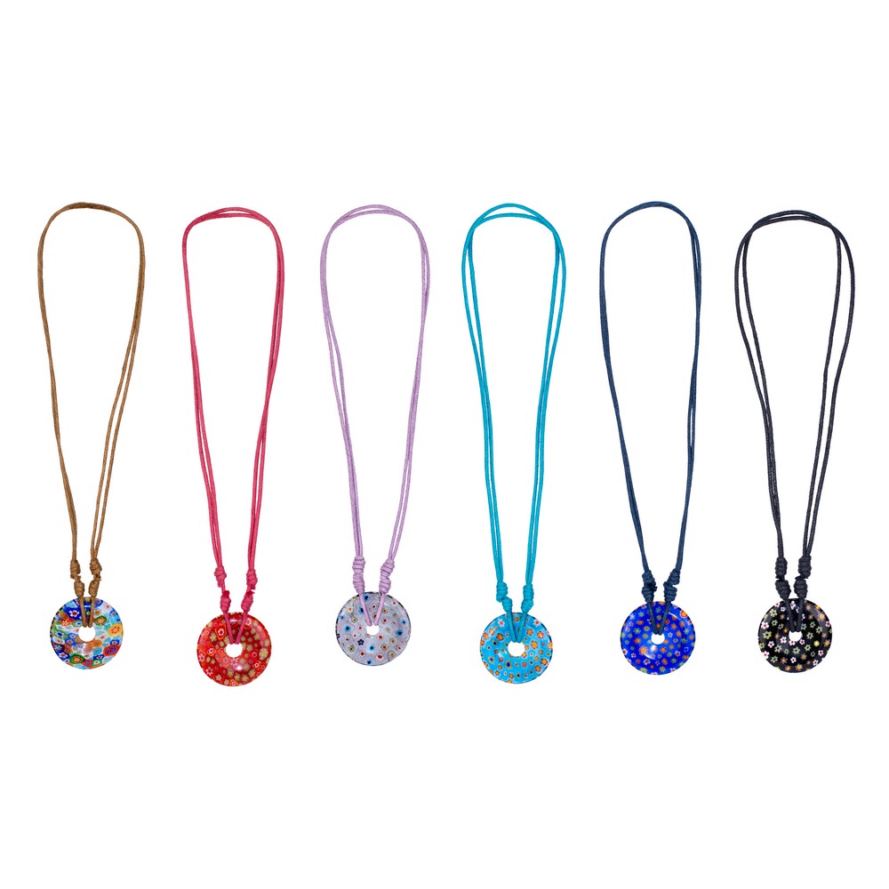 This beautiful necklace choker was made using a glass working technique known as millefiori from the Italian mille – thousand and fiori -flowers. It involves making a design with pieces of glass and then heating and drawing (pulling) the assembled design to make canes which carry the design along the entire length. The canes are then cut into short lengths and the pieces are used to create colourful and unique jewellery or items such as vases and paperweights. The technique was most famously developed and exploited by the glass workers on the island of Murano near Venice and at one time millefiori beads, known as trade beads, were used as a currency.