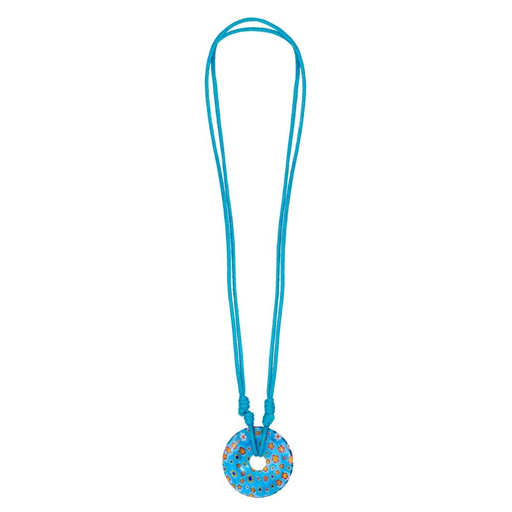 This beautiful necklace choker was made using a glass working technique known as millefiori from the Italian mille – thousand and fiori -flowers. It involves making a design with pieces of glass and then heating and drawing (pulling) the assembled design to make canes which carry the design along the entire length. The canes are then cut into short lengths and the pieces are used to create colourful and unique jewellery or items such as vases and paperweights. The technique was most famously developed and exploited by the glass workers on the island of Murano near Venice and at one time millefiori beads, known as trade beads, were used as a currency.