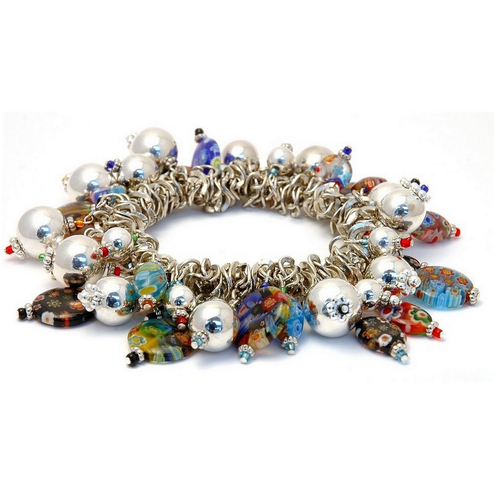 This beautiful bracelet was made using a glass working technique known as millefiori from the Italian mille – thousand and fiori -flowers. It involves making a design with pieces of glass and then heating and drawing (pulling) the assembled design to make canes which carry the design along the entire length. The canes are then cut into short lengths and the pieces are used to create colourful and unique jewellery or items such as vases and paperweights. The technique was most famously developed and exploited by the glass workers on the island of Murano near Venice and at one time millefiori beads, known as trade beads, were used as a currency.