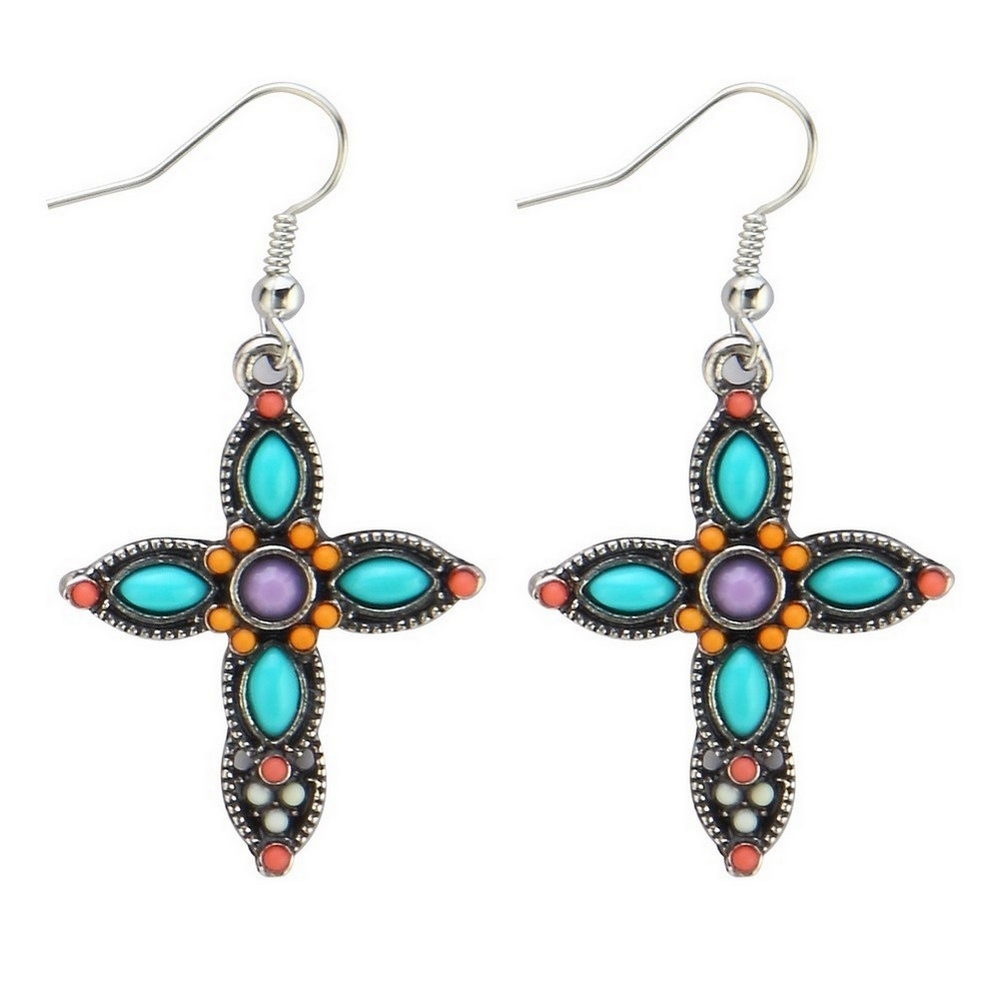 Drop earring enamel embellished benedictine cross purple, orange & turquoise
