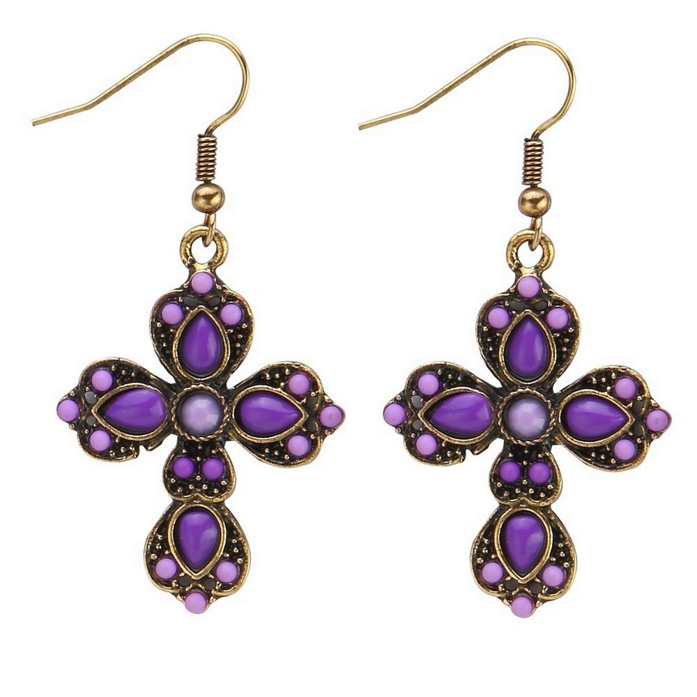 Drop earring enamel embellished french cross purple