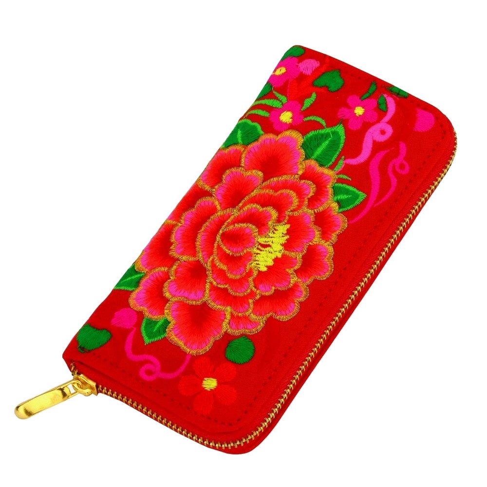 Zip wallet cotton embroidered Aztec dahlia red