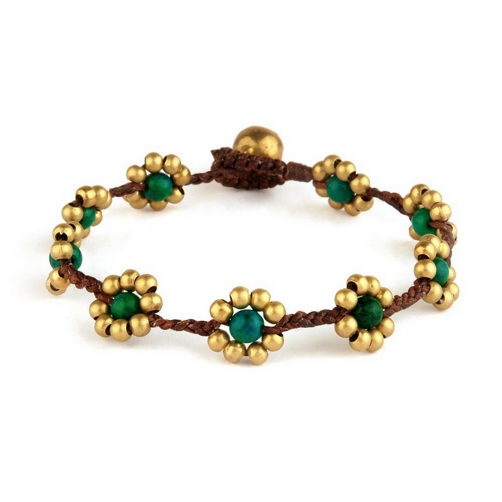 Bracelet brass & cord flower bead coloured centre & bell catch green