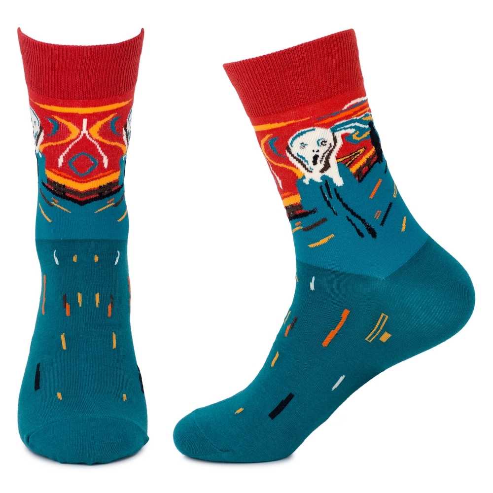 One of the worlds most iconic paintings inspires these classic and kitsch mens socks (fit UK sizes 9-11). Edvard Munchs timeless vision of alienation The Scream is translated into comfortable and durable cotton and spandex to make fun footwear a perfect gift for the neurotic art lover in your life, or for yourself!