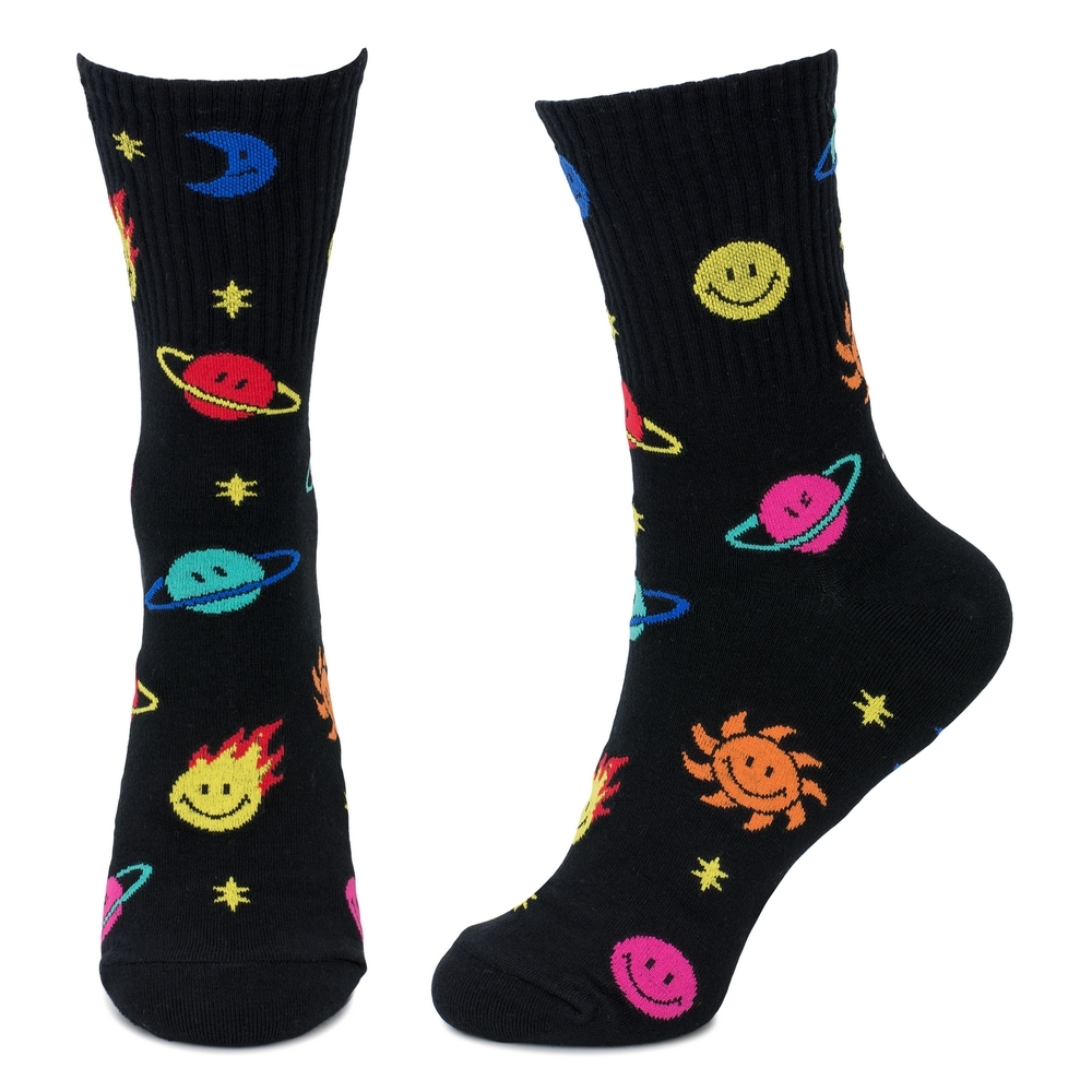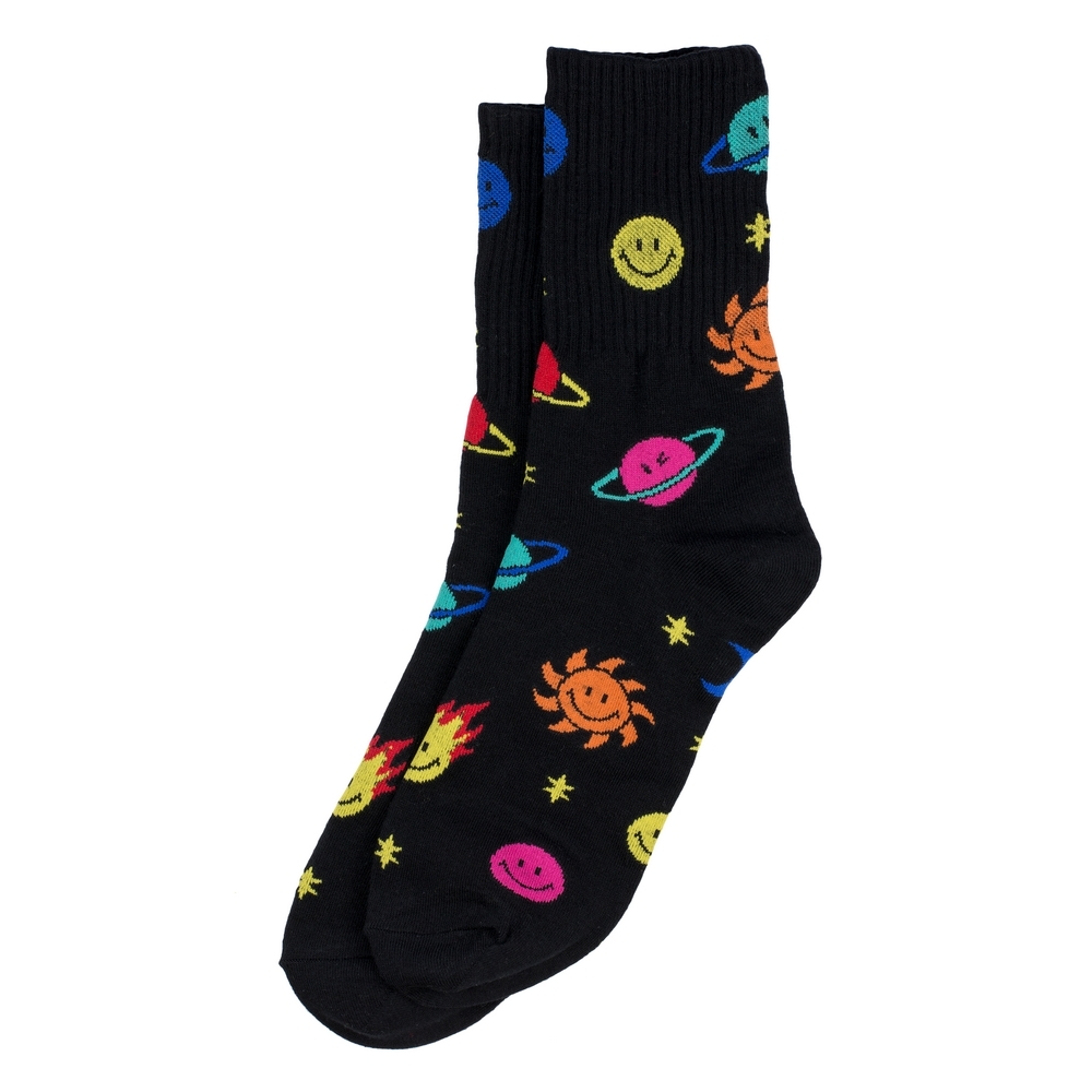 Black cotton-spandex socks with smiley cosmos motifspace-themed novelty for pop culture and youth fashion edits.