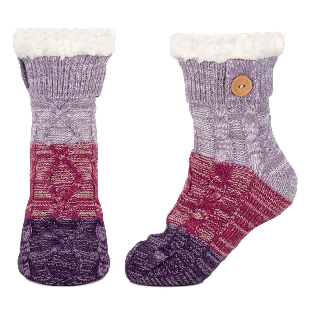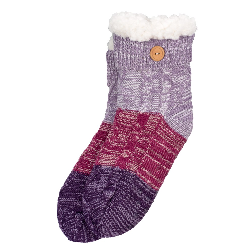 Stay cozy with stylish multicolor knit socks featuring a textured pattern in rich purple, red, and violet hues. Complete with a fluffy white lining and charming button detail, these warm and comfortable socks are perfect for winter lounging or gifting. Shop now!