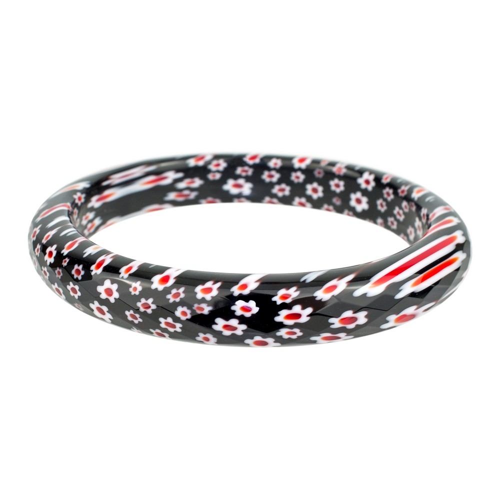 These glass millefiori bangles in rich red, cobalt blue, and classic black. Each piece showcases intricate floral cane patterns formed through traditional Venetian glass techniques. Ideal for boutique jewellery displays, gift sets, or artisan accessory collections.