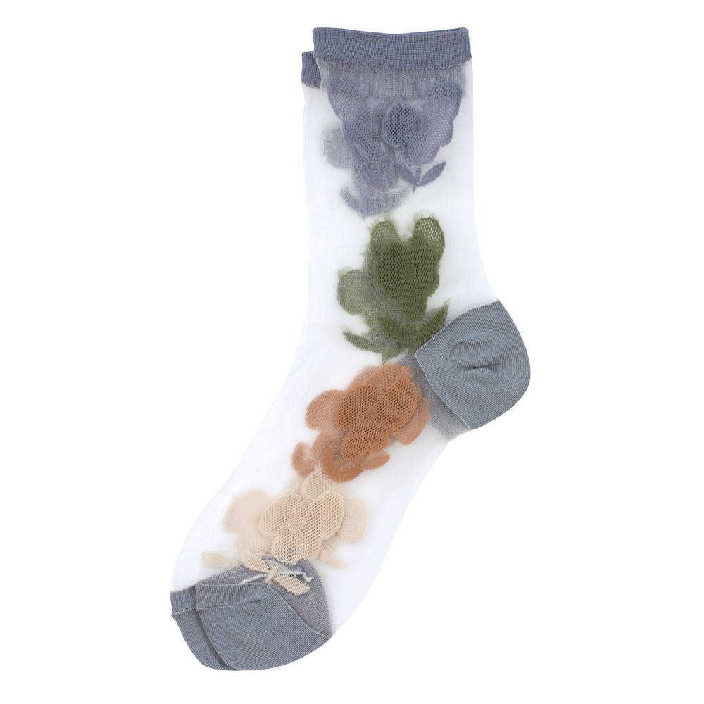 Lightweight sheer socks with subtle grey trim and multicolor floral embroidery. Designed for elevated basics and seasonal novelty lines. Sheer construction and embroidered detail offer premium appeal for spring-summer assortments or curated bundles.