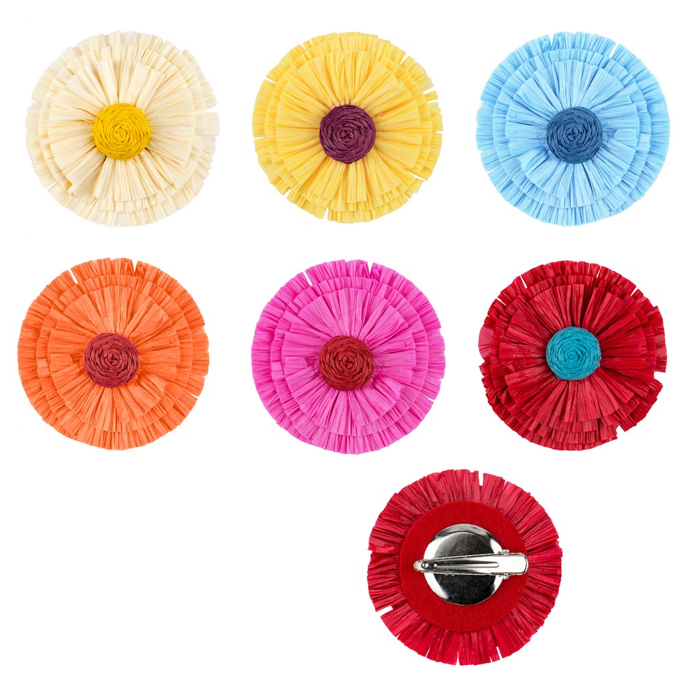 Our Raffia Bloom Hair Clips are a vibrant, handmade addition to any accessory range. Featuring fringed raffia petals and a bold central accent, each clip is secured with a sturdy alligator clasp for easy styling. Sold in assorted color packs, these clips are perfect for boutiques, salons, and seasonal displays.