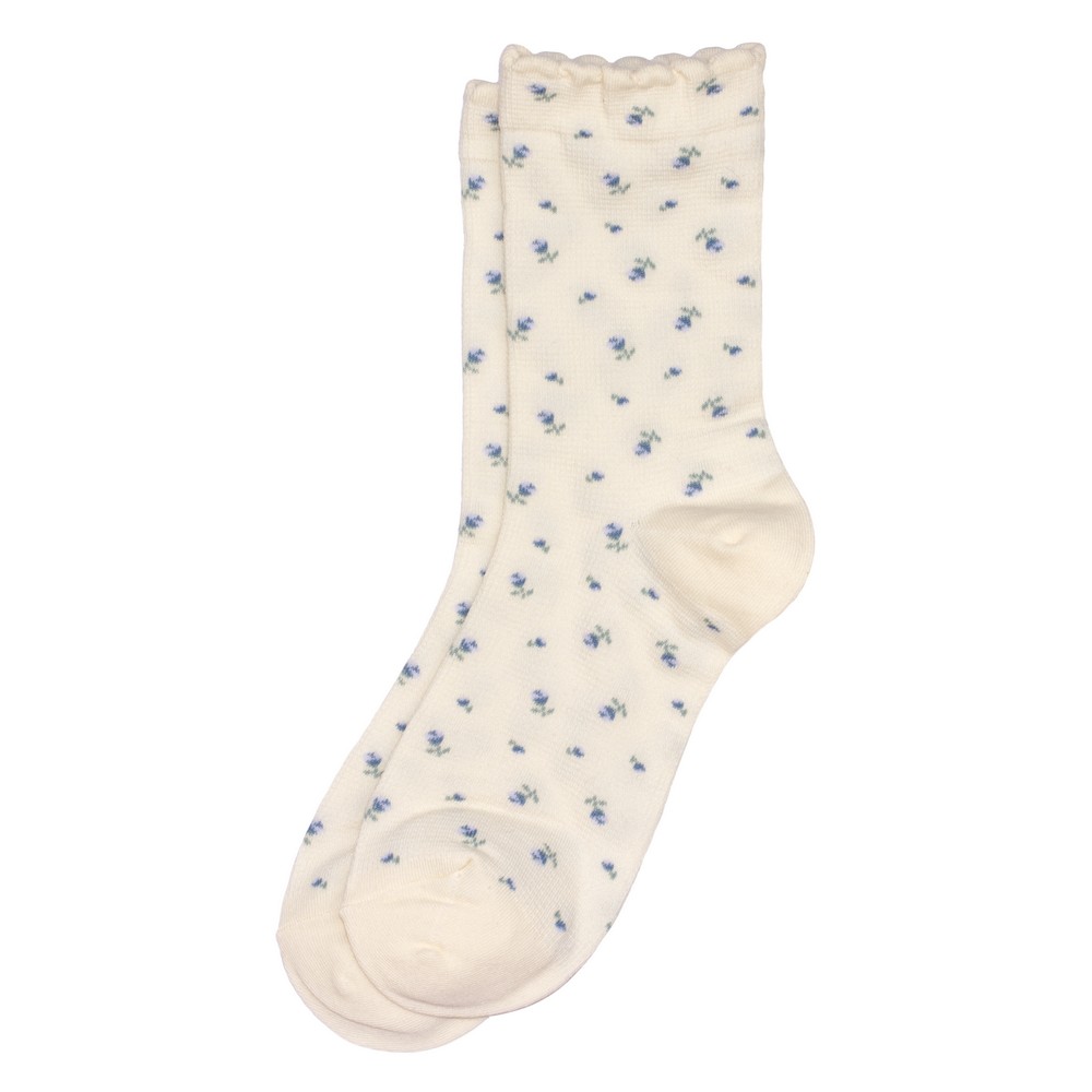 Elegant and versatile, this off-white sock with blue floral detailing is a top seller in boutique and lifestyle categories. The picot edge adds a refined finish, appealing to customers seeking subtle, feminine accessories.