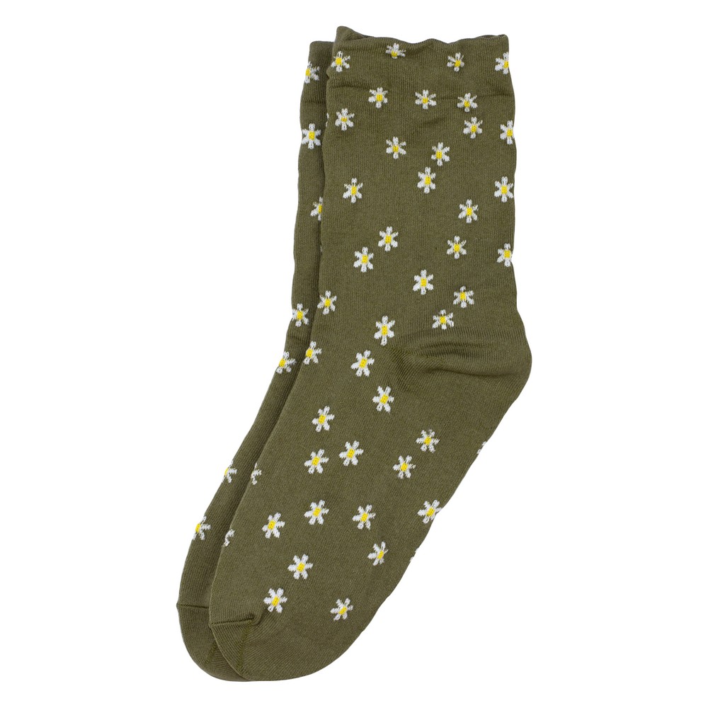 Introduce an in-demand, fashion-forward item to your inventory with our olive green daisy floral crew socks. This colour option provides a unique and sophisticated take on a popular floral pattern, appealing to customers who appreciate a more elevated, nature-inspired palette. This style is perfect for boutiques and online stores focusing on trending apparel and accessories. Made from a high-quality, durable cotton blend, these socks are designed to meet customer expectations for both comfort and longevity. The vibrant daisy print on the rich olive green background ensures they stand out on any display, driving quick sales. Our wholesale lots are a profitable, low-risk addition to your product line and are ready for immediate retail.